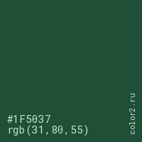 Цвет #1F5037 в цветовой модели RGB обозначается тремя октетами (31, 80, 55) в десятичном формате и #1F5037 в шестнадцатиричном (hex) формате, которые являются интенсивностью красного 31 (hex 1F), интенсивность зелёного 80 (hex 50) и интенсивность синего 55 (hex 37).
