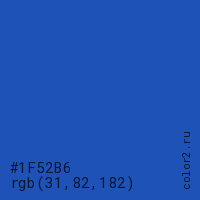 Цвет #1F52B6 в цветовой модели RGB обозначается тремя октетами (31, 82, 182) в десятичном формате и #1F52B6 в шестнадцатиричном (hex) формате, которые являются интенсивностью красного 31 (hex 1F), интенсивность зелёного 82 (hex 52) и интенсивность синего 182 (hex B6).