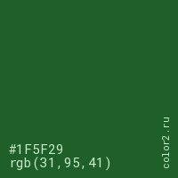 Цвет #1F5F29 в цветовой модели RGB обозначается тремя октетами (31, 95, 41) в десятичном формате и #1F5F29 в шестнадцатиричном (hex) формате, которые являются интенсивностью красного 31 (hex 1F), интенсивность зелёного 95 (hex 5F) и интенсивность синего 41 (hex 29).