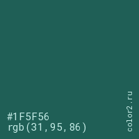 Цвет #1F5F56 в цветовой модели RGB обозначается тремя октетами (31, 95, 86) в десятичном формате и #1F5F56 в шестнадцатиричном (hex) формате, которые являются интенсивностью красного 31 (hex 1F), интенсивность зелёного 95 (hex 5F) и интенсивность синего 86 (hex 56).