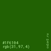 Цвет #1F6104 в цветовой модели RGB обозначается тремя октетами (31, 97, 4) в десятичном формате и #1F6104 в шестнадцатиричном (hex) формате, которые являются интенсивностью красного 31 (hex 1F), интенсивность зелёного 97 (hex 61) и интенсивность синего 4 (hex 04).