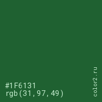 Цвет #1F6131 в цветовой модели RGB обозначается тремя октетами (31, 97, 49) в десятичном формате и #1F6131 в шестнадцатиричном (hex) формате, которые являются интенсивностью красного 31 (hex 1F), интенсивность зелёного 97 (hex 61) и интенсивность синего 49 (hex 31).