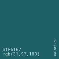 Цвет #1F6167 в цветовой модели RGB обозначается тремя октетами (31, 97, 103) в десятичном формате и #1F6167 в шестнадцатиричном (hex) формате, которые являются интенсивностью красного 31 (hex 1F), интенсивность зелёного 97 (hex 61) и интенсивность синего 103 (hex 67).