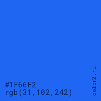 Цвет #1F66F2 в цветовой модели RGB обозначается тремя октетами (31, 102, 242) в десятичном формате и #1F66F2 в шестнадцатиричном (hex) формате, которые являются интенсивностью красного 31 (hex 1F), интенсивность зелёного 102 (hex 66) и интенсивность синего 242 (hex F2).