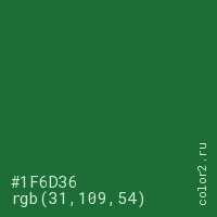 Цвет #1F6D36 в цветовой модели RGB обозначается тремя октетами (31, 109, 54) в десятичном формате и #1F6D36 в шестнадцатиричном (hex) формате, которые являются интенсивностью красного 31 (hex 1F), интенсивность зелёного 109 (hex 6D) и интенсивность синего 54 (hex 36).