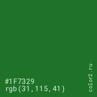 Цвет #1F7329 в цветовой модели RGB обозначается тремя октетами (31, 115, 41) в десятичном формате и #1F7329 в шестнадцатиричном (hex) формате, которые являются интенсивностью красного 31 (hex 1F), интенсивность зелёного 115 (hex 73) и интенсивность синего 41 (hex 29).