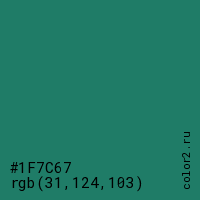 Цвет #1F7C67 в цветовой модели RGB обозначается тремя октетами (31, 124, 103) в десятичном формате и #1F7C67 в шестнадцатиричном (hex) формате, которые являются интенсивностью красного 31 (hex 1F), интенсивность зелёного 124 (hex 7C) и интенсивность синего 103 (hex 67).