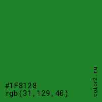 Цвет #1F8128 в цветовой модели RGB обозначается тремя октетами (31, 129, 40) в десятичном формате и #1F8128 в шестнадцатиричном (hex) формате, которые являются интенсивностью красного 31 (hex 1F), интенсивность зелёного 129 (hex 81) и интенсивность синего 40 (hex 28).