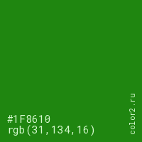 Цвет #1F8610 в цветовой модели RGB обозначается тремя октетами (31, 134, 16) в десятичном формате и #1F8610 в шестнадцатиричном (hex) формате, которые являются интенсивностью красного 31 (hex 1F), интенсивность зелёного 134 (hex 86) и интенсивность синего 16 (hex 10).