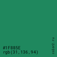 Цвет #1F885E в цветовой модели RGB обозначается тремя октетами (31, 136, 94) в десятичном формате и #1F885E в шестнадцатиричном (hex) формате, которые являются интенсивностью красного 31 (hex 1F), интенсивность зелёного 136 (hex 88) и интенсивность синего 94 (hex 5E).