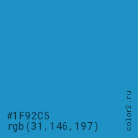 Цвет #1F92C5 в цветовой модели RGB обозначается тремя октетами (31, 146, 197) в десятичном формате и #1F92C5 в шестнадцатиричном (hex) формате, которые являются интенсивностью красного 31 (hex 1F), интенсивность зелёного 146 (hex 92) и интенсивность синего 197 (hex C5).