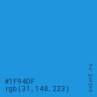 Цвет #1F94DF в цветовой модели RGB обозначается тремя октетами (31, 148, 223) в десятичном формате и #1F94DF в шестнадцатиричном (hex) формате, которые являются интенсивностью красного 31 (hex 1F), интенсивность зелёного 148 (hex 94) и интенсивность синего 223 (hex DF).