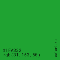 Цвет #1FA332 в цветовой модели RGB обозначается тремя октетами (31, 163, 50) в десятичном формате и #1FA332 в шестнадцатиричном (hex) формате, которые являются интенсивностью красного 31 (hex 1F), интенсивность зелёного 163 (hex A3) и интенсивность синего 50 (hex 32).