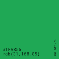 Цвет #1FA855 в цветовой модели RGB обозначается тремя октетами (31, 168, 85) в десятичном формате и #1FA855 в шестнадцатиричном (hex) формате, которые являются интенсивностью красного 31 (hex 1F), интенсивность зелёного 168 (hex A8) и интенсивность синего 85 (hex 55).