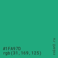 Цвет #1FA97D в цветовой модели RGB обозначается тремя октетами (31, 169, 125) в десятичном формате и #1FA97D в шестнадцатиричном (hex) формате, которые являются интенсивностью красного 31 (hex 1F), интенсивность зелёного 169 (hex A9) и интенсивность синего 125 (hex 7D).