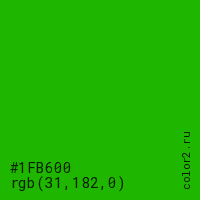 Цвет #1FB600 в цветовой модели RGB обозначается тремя октетами (31, 182, 0) в десятичном формате и #1FB600 в шестнадцатиричном (hex) формате, которые являются интенсивностью красного 31 (hex 1F), интенсивность зелёного 182 (hex B6) и интенсивность синего 0 (hex 00).