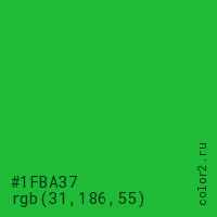 Цвет #1FBA37 в цветовой модели RGB обозначается тремя октетами (31, 186, 55) в десятичном формате и #1FBA37 в шестнадцатиричном (hex) формате, которые являются интенсивностью красного 31 (hex 1F), интенсивность зелёного 186 (hex BA) и интенсивность синего 55 (hex 37).