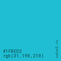 Цвет #1FBED2 в цветовой модели RGB обозначается тремя октетами (31, 190, 210) в десятичном формате и #1FBED2 в шестнадцатиричном (hex) формате, которые являются интенсивностью красного 31 (hex 1F), интенсивность зелёного 190 (hex BE) и интенсивность синего 210 (hex D2).