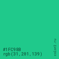Цвет #1FC98B в цветовой модели RGB обозначается тремя октетами (31, 201, 139) в десятичном формате и #1FC98B в шестнадцатиричном (hex) формате, которые являются интенсивностью красного 31 (hex 1F), интенсивность зелёного 201 (hex C9) и интенсивность синего 139 (hex 8B).