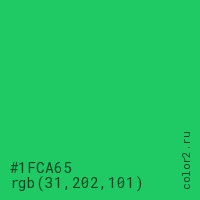 Цвет #1FCA65 в цветовой модели RGB обозначается тремя октетами (31, 202, 101) в десятичном формате и #1FCA65 в шестнадцатиричном (hex) формате, которые являются интенсивностью красного 31 (hex 1F), интенсивность зелёного 202 (hex CA) и интенсивность синего 101 (hex 65).