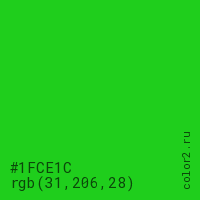 Цвет #1FCE1C в цветовой модели RGB обозначается тремя октетами (31, 206, 28) в десятичном формате и #1FCE1C в шестнадцатиричном (hex) формате, которые являются интенсивностью красного 31 (hex 1F), интенсивность зелёного 206 (hex CE) и интенсивность синего 28 (hex 1C).