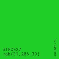 Цвет #1FCE27 в цветовой модели RGB обозначается тремя октетами (31, 206, 39) в десятичном формате и #1FCE27 в шестнадцатиричном (hex) формате, которые являются интенсивностью красного 31 (hex 1F), интенсивность зелёного 206 (hex CE) и интенсивность синего 39 (hex 27).