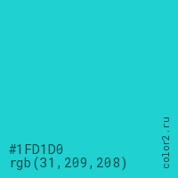 Цвет #1FD1D0 в цветовой модели RGB обозначается тремя октетами (31, 209, 208) в десятичном формате и #1FD1D0 в шестнадцатиричном (hex) формате, которые являются интенсивностью красного 31 (hex 1F), интенсивность зелёного 209 (hex D1) и интенсивность синего 208 (hex D0).