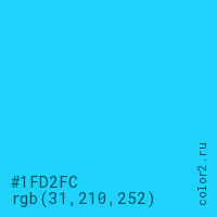 Цвет #1FD2FC в цветовой модели RGB обозначается тремя октетами (31, 210, 252) в десятичном формате и #1FD2FC в шестнадцатиричном (hex) формате, которые являются интенсивностью красного 31 (hex 1F), интенсивность зелёного 210 (hex D2) и интенсивность синего 252 (hex FC).