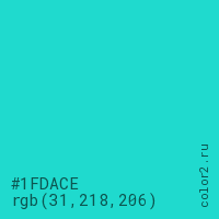 Цвет #1FDACE в цветовой модели RGB обозначается тремя октетами (31, 218, 206) в десятичном формате и #1FDACE в шестнадцатиричном (hex) формате, которые являются интенсивностью красного 31 (hex 1F), интенсивность зелёного 218 (hex DA) и интенсивность синего 206 (hex CE).