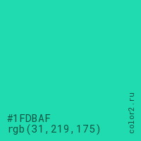 Цвет #1FDBAF в цветовой модели RGB обозначается тремя октетами (31, 219, 175) в десятичном формате и #1FDBAF в шестнадцатиричном (hex) формате, которые являются интенсивностью красного 31 (hex 1F), интенсивность зелёного 219 (hex DB) и интенсивность синего 175 (hex AF).