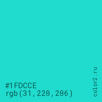 Цвет #1FDCCE в цветовой модели RGB обозначается тремя октетами (31, 220, 206) в десятичном формате и #1FDCCE в шестнадцатиричном (hex) формате, которые являются интенсивностью красного 31 (hex 1F), интенсивность зелёного 220 (hex DC) и интенсивность синего 206 (hex CE).
