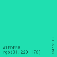 Цвет #1FDFB0 в цветовой модели RGB обозначается тремя октетами (31, 223, 176) в десятичном формате и #1FDFB0 в шестнадцатиричном (hex) формате, которые являются интенсивностью красного 31 (hex 1F), интенсивность зелёного 223 (hex DF) и интенсивность синего 176 (hex B0).
