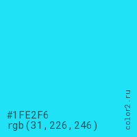 Цвет #1FE2F6 в цветовой модели RGB обозначается тремя октетами (31, 226, 246) в десятичном формате и #1FE2F6 в шестнадцатиричном (hex) формате, которые являются интенсивностью красного 31 (hex 1F), интенсивность зелёного 226 (hex E2) и интенсивность синего 246 (hex F6).