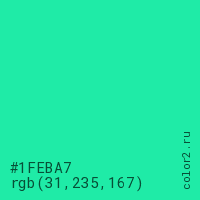 Цвет #1FEBA7 в цветовой модели RGB обозначается тремя октетами (31, 235, 167) в десятичном формате и #1FEBA7 в шестнадцатиричном (hex) формате, которые являются интенсивностью красного 31 (hex 1F), интенсивность зелёного 235 (hex EB) и интенсивность синего 167 (hex A7).