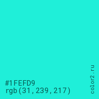 Цвет #1FEFD9 в цветовой модели RGB обозначается тремя октетами (31, 239, 217) в десятичном формате и #1FEFD9 в шестнадцатиричном (hex) формате, которые являются интенсивностью красного 31 (hex 1F), интенсивность зелёного 239 (hex EF) и интенсивность синего 217 (hex D9).