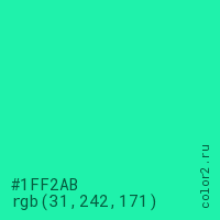 Цвет #1FF2AB в цветовой модели RGB обозначается тремя октетами (31, 242, 171) в десятичном формате и #1FF2AB в шестнадцатиричном (hex) формате, которые являются интенсивностью красного 31 (hex 1F), интенсивность зелёного 242 (hex F2) и интенсивность синего 171 (hex AB).