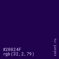 Цвет #20024F в цветовой модели RGB обозначается тремя октетами (32, 2, 79) в десятичном формате и #20024F в шестнадцатиричном (hex) формате, которые являются интенсивностью красного 32 (hex 20), интенсивность зелёного 2 (hex 02) и интенсивность синего 79 (hex 4F).