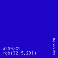 Цвет #2005C9 в цветовой модели RGB обозначается тремя октетами (32, 5, 201) в десятичном формате и #2005C9 в шестнадцатиричном (hex) формате, которые являются интенсивностью красного 32 (hex 20), интенсивность зелёного 5 (hex 05) и интенсивность синего 201 (hex C9).