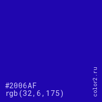 Цвет #2006AF в цветовой модели RGB обозначается тремя октетами (32, 6, 175) в десятичном формате и #2006AF в шестнадцатиричном (hex) формате, которые являются интенсивностью красного 32 (hex 20), интенсивность зелёного 6 (hex 06) и интенсивность синего 175 (hex AF).