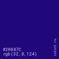 Цвет #20087C в цветовой модели RGB обозначается тремя октетами (32, 8, 124) в десятичном формате и #20087C в шестнадцатиричном (hex) формате, которые являются интенсивностью красного 32 (hex 20), интенсивность зелёного 8 (hex 08) и интенсивность синего 124 (hex 7C).