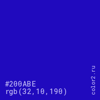 Цвет #200ABE в цветовой модели RGB обозначается тремя октетами (32, 10, 190) в десятичном формате и #200ABE в шестнадцатиричном (hex) формате, которые являются интенсивностью красного 32 (hex 20), интенсивность зелёного 10 (hex 0A) и интенсивность синего 190 (hex BE).