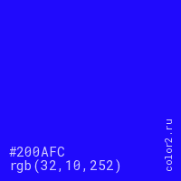Цвет #200AFC в цветовой модели RGB обозначается тремя октетами (32, 10, 252) в десятичном формате и #200AFC в шестнадцатиричном (hex) формате, которые являются интенсивностью красного 32 (hex 20), интенсивность зелёного 10 (hex 0A) и интенсивность синего 252 (hex FC).