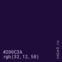 Цвет #200C3A в цветовой модели RGB обозначается тремя октетами (32, 12, 58) в десятичном формате и #200C3A в шестнадцатиричном (hex) формате, которые являются интенсивностью красного 32 (hex 20), интенсивность зелёного 12 (hex 0C) и интенсивность синего 58 (hex 3A).