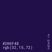 Цвет #200F48 в цветовой модели RGB обозначается тремя октетами (32, 15, 72) в десятичном формате и #200F48 в шестнадцатиричном (hex) формате, которые являются интенсивностью красного 32 (hex 20), интенсивность зелёного 15 (hex 0F) и интенсивность синего 72 (hex 48).