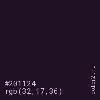 Цвет #201124 в цветовой модели RGB обозначается тремя октетами (32, 17, 36) в десятичном формате и #201124 в шестнадцатиричном (hex) формате, которые являются интенсивностью красного 32 (hex 20), интенсивность зелёного 17 (hex 11) и интенсивность синего 36 (hex 24).