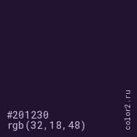 Цвет #201230 в цветовой модели RGB обозначается тремя октетами (32, 18, 48) в десятичном формате и #201230 в шестнадцатиричном (hex) формате, которые являются интенсивностью красного 32 (hex 20), интенсивность зелёного 18 (hex 12) и интенсивность синего 48 (hex 30).