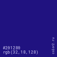 Цвет #201280 в цветовой модели RGB обозначается тремя октетами (32, 18, 128) в десятичном формате и #201280 в шестнадцатиричном (hex) формате, которые являются интенсивностью красного 32 (hex 20), интенсивность зелёного 18 (hex 12) и интенсивность синего 128 (hex 80).