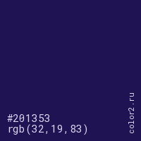 Цвет #201353 в цветовой модели RGB обозначается тремя октетами (32, 19, 83) в десятичном формате и #201353 в шестнадцатиричном (hex) формате, которые являются интенсивностью красного 32 (hex 20), интенсивность зелёного 19 (hex 13) и интенсивность синего 83 (hex 53).