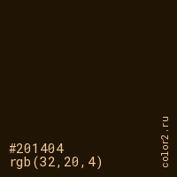 Цвет #201404 в цветовой модели RGB обозначается тремя октетами (32, 20, 4) в десятичном формате и #201404 в шестнадцатиричном (hex) формате, которые являются интенсивностью красного 32 (hex 20), интенсивность зелёного 20 (hex 14) и интенсивность синего 4 (hex 04).