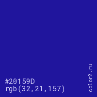 Цвет #20159D в цветовой модели RGB обозначается тремя октетами (32, 21, 157) в десятичном формате и #20159D в шестнадцатиричном (hex) формате, которые являются интенсивностью красного 32 (hex 20), интенсивность зелёного 21 (hex 15) и интенсивность синего 157 (hex 9D).